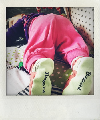 Auf den Bauch dreht sich unsere Frieda nun ja schon etwas länger. Bisher lag sie dann allerdings immer da, ruderte mit den Armen wie eine kleine Robbe und fing dann immer an zu nörgeln. Nun robbt sie sich, im wahrsten Sinne des Wortes, aber ganz langsam vorwärts. Die richtige Technik hat sie dabei zwar noch nicht gefunden, denn sie schiebt ihr Gesicht noch über den Boden und hebt den Kopf dabei nicht an, Beine und Arme machen inzwischen jedoch schon fast erfolgsversprechende Bewegungen. Ausgestattet mit den wunderschönen rosafarbenen Hunde-Krabbelschuhen von buzzies hat Frieda nun auch etwas mehr Grip! Es bleibt spannend. [Für den Link zu den Buzzies erhalte ich Null-Komma-Nix!]