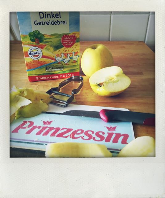 Seit einiger Zeit lese ich mich natürlich in das Thema ein. Ratgeber lesen macht mich allerdings wahnsinnig, denn in jedem steht eine andere Empfehlung. Einmal soll der 2.Brei abends gefüttert werden und ein Milch-Getreide-Brei sein und ein anderes Mal lieber Vor- oder Nachmittags ein Obst-Getreide-Brei. Ich legte die Beikost-Bücher zur Seite und verließ mich auf mein Gefühl. Ein Obst-Getreide-Brei sollte es sein, denn irgendwie hatte ich auch ein bißchen Angst vor einer Horrornacht, falls unser Mini-Menschen-Mädchen den abendlichen Milch-Getreidebrei widererwartend nicht gut vertragen würde. Da ich außerdem nicht das Gefühl habe, eine ruhigere Nacht mit weniger Stillzeiten zu brauchen, fiel das Argument mit dem “länger statt bleiben” ohnehin schon mal weg. Sowieso hatte ich von anderen Mütter bereits gehört, dass Flaschennahrung oder auch ein Abendbrei nicht zwangsläufig zu längeren Schlafphasen führt, sondern die Kinder trotzdem weiterhin aufwachen. Das liege gar nicht so sehr am Hunger, sondern dass sie sich nach einem nächtlichen Aufwachen noch nicht selbst wieder beruhigen können. Ich kochte also aus milden Äpfeln (Golden Delicious) Apfelmus ein und quälte mich durch den Dschungel von Schmelzflocken, verschiedenen Getreideflocken und Fertigbreien im Drogeriemarkt meines Vertrauens. Bis ich erstmal gecheckt hatte, dass der milchfreie “Getreidebrei von Alnatura” lediglich aus dem entsprechenden Getreidevollkornmehl und Thiamin (in Babynahrung gesetzlich vorgeschrieben) besteht und eigentlich genau das ist, was ich suche. Ich wollte nämlich auf keinen Fall einen Fertigbrei, sondern nur die einzelnen Zutaten. Am Ende ist es dann der Dinkelbrei von Alnatura geworden. Gute Entscheidung. Frieda verputzt die 150g des Breis so rasant und meckert wenn es ihr nicht schnell genug geht.