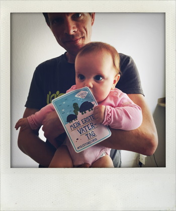 Am Donnerstag war dann auch noch Friedas 1. Vatertag. Zum Glück gab es auch zu diesem Anlass eine deutsche Version der Erinnerungskarten auf der Website der Milestonecards zum Download. Mittlerweile hält Frieda Dinge auch mal länger als 3 Sekunden fest, so dass sie die Karte selbst in die Kamera halten konnte. Für ihren Papa hatte sie auch ein Geschenk, denn der braucht jetzt aber mal wirklich dringend neue Kopfhörer, um in Ruhe (und natürlich auch ohne seine Mädels zu stören!) seine Musik hören zu können. Den Nachmittag verbrachten wir dann mit Freunden in “unserem” Klingelpützpark und ließen dort den Vatertag ausklingen. Super schön!
