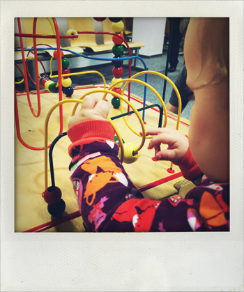 Ach so…und da Frieda so einen großen Spaß mit der Motorikschleife im Bürgeramt hatte, bin ich mittags mit ihr nochmal in die Stadt gelaufen und habe in einem der tollsten Spielwarenläden der Innenstadt eine kleine Motorikschleife für Babys ab 6 Monaten besorgt. Natürlich hatte ich so ein Ding schon im Hinterkopf, dachte jedoch, dass es nur Versionen für ältere Kinder geben würde, für die Frieda definitiv noch zu jung und zu klein ist. Fast den gesamten Nachmittag war unser Mini-Menschen-Mädchen dann heute mit ihrem neuen Spielzeug beschäftigt. Sehr niedlich.