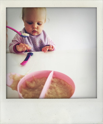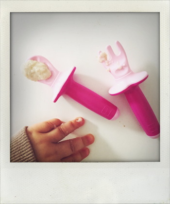 Wir haben das Esslernbesteck zwar sofort getestet und der Griff mit seiner samtigen Oberfläche liegt unserem Mini-Menschen-Mädchen tatsächlich bereits gut in der Hand, doch hat sie es mit ihren (fast) 9 Monaten noch nicht ganz gecheckt, dass sie mit diesem “Löffelchen” gerne selbst im Essen herumstochern darf. Der Brei bleibt nämlich automatisch an der gerippten Struktur des Löffels hängen und wartet nur darauf, von ihr selbst in den Mund geführt zu werden. Dafür muss sie wahrscheinlich erstmal noch etwas älter werden und noch mehr Selbstständigkeit beim Essen entwickeln. Sicherlich wird Frieda mit diesem Set aus Löffel + Gabel so richtigen Spaß haben, wenn es ganz bald darum geht kleine Erbsen aufzuspießen oder mit Nudeln und Tomatensauce eine große Kleckerei zu veranstalten.