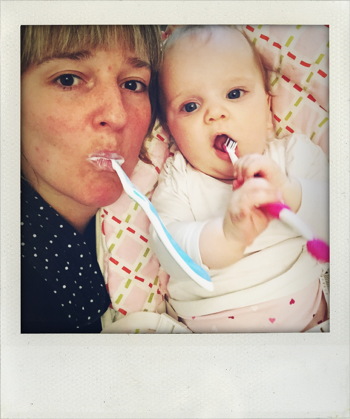 mam2Learn to brush set: Wer ordentlich futtert, der muss auch gut putzen. Obwohl bei unserem Mini-Menschen-Mädchen bis jetzt noch kein einziger Zahn in Sicht ist, gehört zumindestens das abendliche Zähneputzen bereits seit einiger Zeit zu unserem festen Zubettgeh-Ritual. Alles, was ritualisiert und mit Spaß aufgebaut wurde, fällt dann irgendwann leicht(er) wenn es sein MUSS. Mit der MAM-Trainingsbrush mit dem extra-langen und ergonomisch geformten Griff können Eltern und Babys die Zahnbürste gemeinsam halten. Für die perfekte Unterstützung der ersten Putzbewegungen. Am unteren Ende der Zahnbürste befindet sich ein Massagekopf für die Massage von empfindlichem Zahnfleisch. Gerade beim Zahnen gefällt er ganz wunderbar. Wie man unschwer auf dem Foto erkennen kann, schrubbt Frieda mit ihrer Zahnbürste schon wie eine Große. Ebenfalls in unserem Set enthalten ist die kleine First Brush, die dann in Zukunft irgendwann zum Einsatz kommt, sobald unser Mini-Menschen-Mädchen selbstständig putzen kann. Eine MAM-Zahnbürste wurde uns übrigens bereits vor diesem Produkttest hier in der Apotheke unseres Vertrauens empfohlen. Wir sind also echte Trainingsbrush-Fans und erstmal kommt unserem Mini-Menschen-Mädchen keine andere Zahnbürste in den Mund.