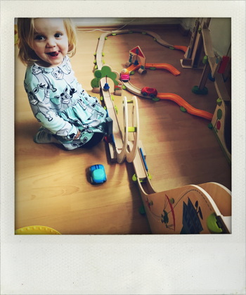 und wir verbrachten einen tollen gemeinsamen Vor-Gerburtstagstag miteinander. Der Geburtstag begann dann übrigens ziemlich früh – für einen Samstag für meinen Geschmack etwas zu früh, aber so ist das eben mit unseren lieben Mini-Menschen-Kindern. So hatten wir alle aber doch noch reichlich Zeit zum Spielen, Putzen, Tischdecken, Singen, Tanzen, Malen und Stylen bevor die restliche Family aus meiner Heimatstadt eintrudelte. Dann ging sie los, die kleine Sause. Die Wunderkerzen-Zwei wurde angezündet und der Kuchen gemampft. Unser Mini-Menschen-Mädchen packte natürlich auch fleißig Geschenke aus und bespielte sie sofort. Neben dem Stoffpferd und einer zauberhaften Elfen-Feen-Wichtel-Tür bekam unsere Frieda auch noch einige Sets und Ergänzungsteile für die tolle Kullerbü-Bahn, von der wir inzwischen richtig große Fans sind (bald gibt’s hier auf dem Blog einen extra Bericht zu dieser genialen Kugelbahn). Ganz neu auf dem Markt ist nämlich jetzt auch die