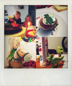 Falls ihr nun noch Infos zu Deko und Geschenken wollt: Die HABA Kullerbü-Sets und reichlich Zubehör, das Pferd Leopold, die Geburtstagsspirale von Grimms und unsere Holztiger-Deko-Figuren gibt’s übrigens auch in unserem Lieblingsonlineshop “Holzfarm“. Die wunderschöne Geburtstagskerze ist aus Sibylles Kerzenlädchen, das Dino-Shirt aus der aktuellen Kollektion von Maxomorra und wer die MilestoneCards noch nicht kennt, sollte sie echt schnell kennenlernen.