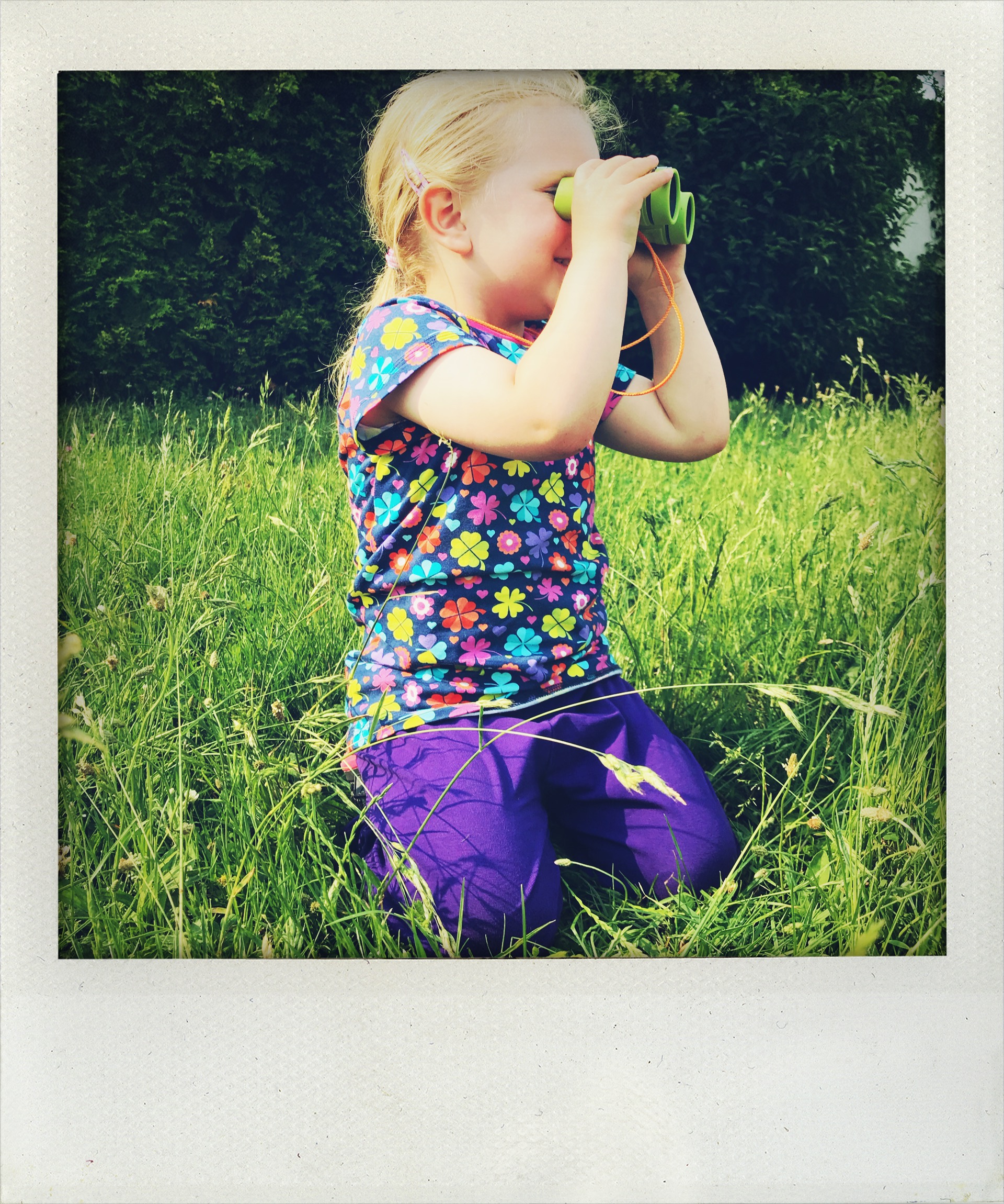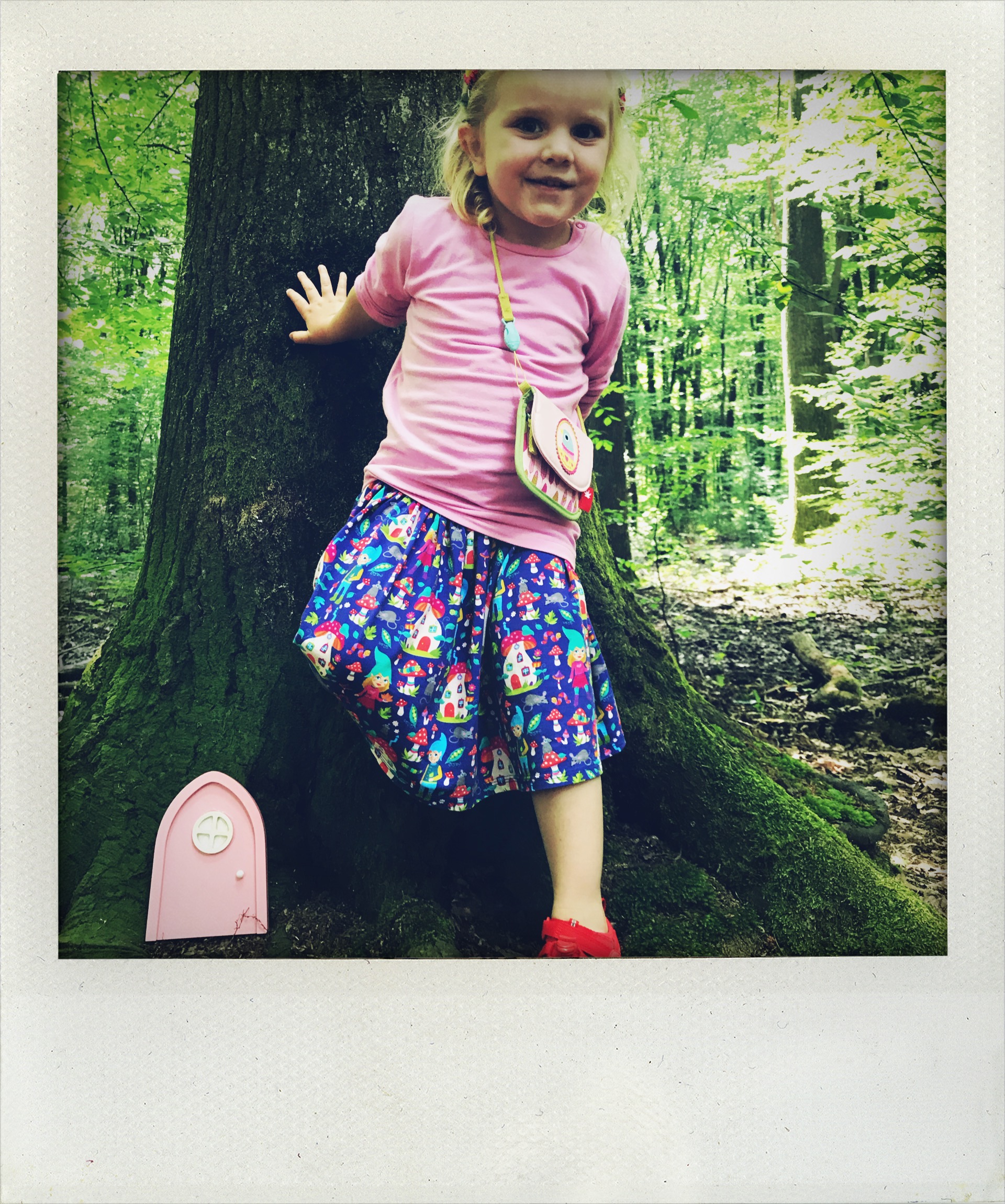 Wir lieben unsere gemeinsame Familienzeit sehr und verbringen sie seit unserem Umzug ja noch viel lieber draußen. Ich habe euch schon öfter davon vorgeschwärmt, aber es ist wirklich so wunderbar mit Kindern die Natur zu entdecken, mit dem Fernglas durch die Wiesen voller Klee zu streifen und Tiere zu beobachten oder ihren Stimmen zu lauschen. Gerade für kindliche Aktivitäten draußen muss es bei unserer Frieda dann gerne bequeme Jersey-Kleidung sein, mit denen sie klettern, rennen und spielen darf. Und trotzdem ist sie jetzt in einem Alter, in dem sie sich auch im Wald gerne mal etwas schicker macht, ein Röckchen anzieht und auch noch den Blumen-Haarreif in ihr Haar steckt. Das kleine Handtäschchen darf dann aber natürlich auch nicht fehlen. So bunt mit ihrem Elfen-Röckchen oder dem Klee-Shirt gekleidet geht sie dann mit mir auf Entdeckungstour. Wir suchen zum Beispiel nach kleinen Elfentüren an großen, dicken Bäumen, denn die geheimnisvolle Geschichte dieser magischen Wesen fasziniert unsere Frieda total. So war es auch kein Wunder, dass der farbenfrohe Elfen-Rock “FairyWonderworld” und ihr