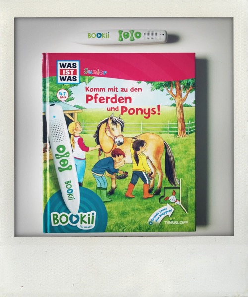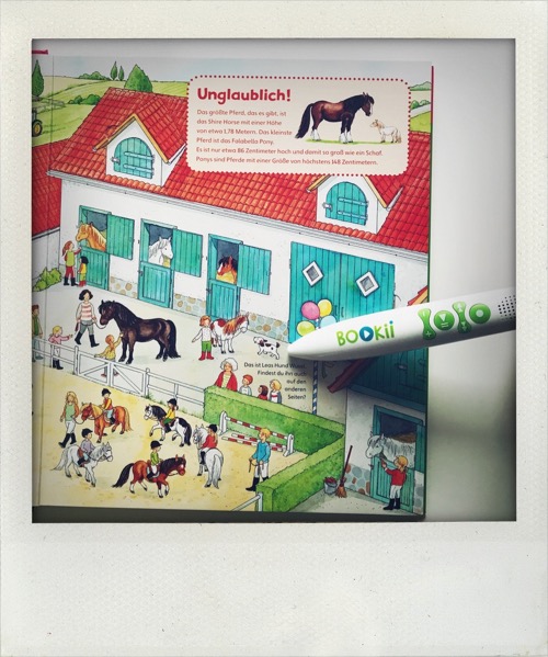 booki3Dass es für unsere kleine Pferdeprinzessin unbedingt das BOOKii-Buch WAS IST WAS Junior Komm mit zu den Pferden und Ponys! sein musste, muss ich euch ja wahrscheinlich nicht erzählen. Mit dem Bookii Hörstift kann unsere Frieda verschiedene Situationen auf dem Reiterhof nochmal nachspielen. Durch leichtes Antippen mit dem Stift sind typische Geräusche, lustige Dialoge und spannende Informationen über Pferderassen, Pferdepflege, Verhaltensweisen und die Kommunikation der Pferde zu hören. Insgesamt gibt es in dem Buch tatsächlich über 650 Hörerlebnissen und zusätzlich gibt es noch Linktipps zu kostenlosen Download-Vorlagen. Wirklich sehr umfangreich. So wird es niemals langweilig. Unser Mini-Menschen-Mädchen mag das Buch sehr und es vergeht im Moment kein Tag, an dem dieses interaktive Buch nicht aus dem Bücherregal genommen wird.