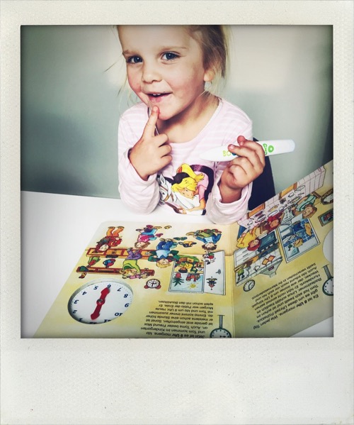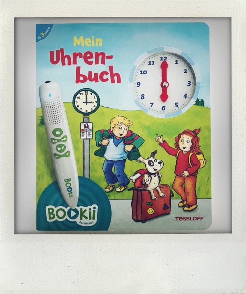 bookii4Das zweite BOOKii-Buch, das sich unsere Frieda sofort gewünscht hat, ist: Mein Uhrenbuch. Sowieso interessiert  sie sich schon etwas länger für die Uhr und die Uhrzeiten, das Ablesen der Zeiten ist aber natürlich noch etwas schwierig. Das interaktive Buch, um die Uhr zu lernen ist deshalb besonders hoch im Kurs. Spielerisch lernen unsere kleinen Menschen so Tageszeiten, -abläufe kennen und entwickeln langsam ein Verständnis dafür. Wann beginnt der Kindergarten? Um wie viel Uhr isst die Familie zu Mittag? Und ist es wirklich schon Zeit zum Schlafen gehen? Durch Antippen mit dem Bookii Hörstift können sich die Kinder alle erklärenden Texte vorlesen lassen, der Stift lässt Personen und Gegenstände sprechen und die interaktiven Spiele sorgen für Abwechslung und Unterhaltung. Ganz nebenbei kann man dann selbst noch mit der kleinen Uhr die einzelnen Uhrzeiten einstellen über und sich gegenseitig schöne Rätsel oder Aufgaben stellen. Auch das Uhrenbuch ist natürlich durch kurzweilige rund um die Uhr gespickt.